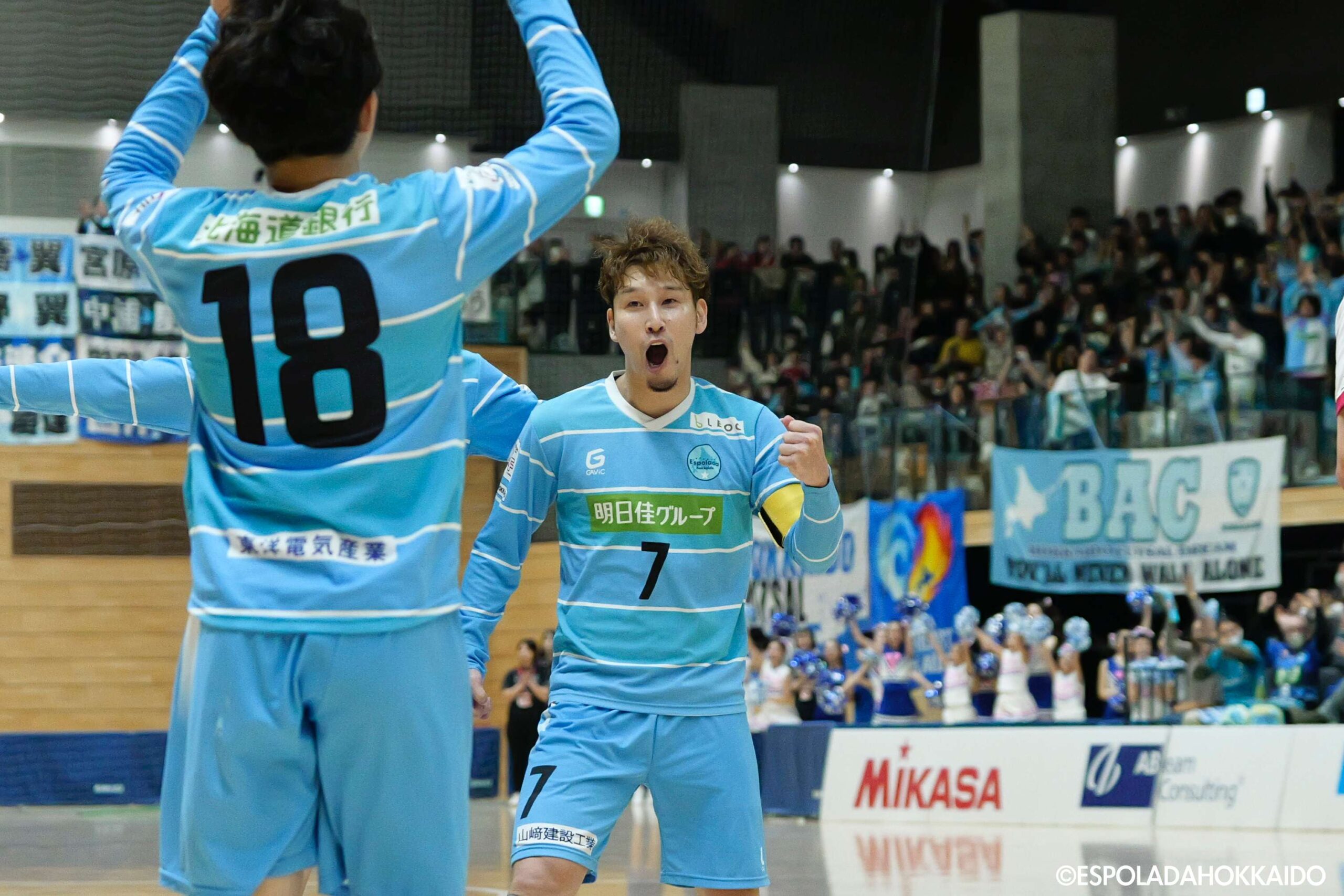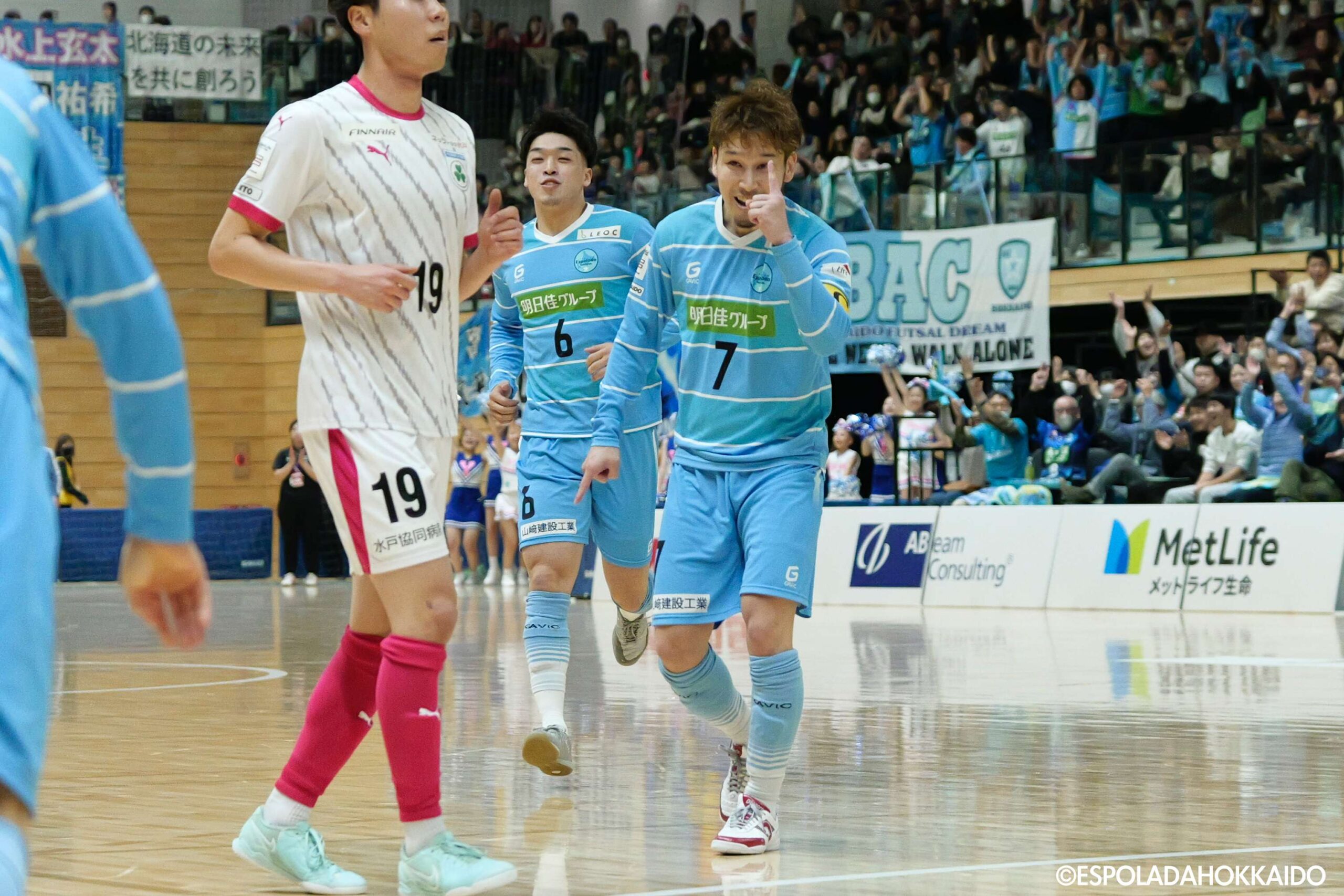 ホーム・北ガスアリーナ札幌46で行われた試合に3202人の観客が詰めかけた一戦は、北海道が序盤から主導権をにぎり、5分にエース・室田祐希が先制点。11分に相手ゴール前で巧みにパスをつなぎ、最後は西村啓のゴールでリードを広げると、15分に再び室田、16分に宮原勇哉が決めて4-0で試合を折り返す。