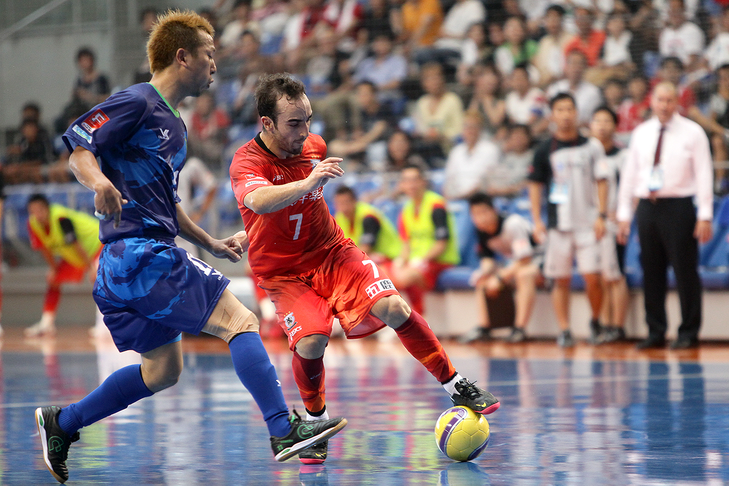 第2ピリオドも中盤に差しかかったところで、リカルジーニョは相手のパスをそのまま胸トラップで処理すると、“シャペウ”で相手を交わそうと試みる。しかし、それをキャンセルしてボールの落ち際を右足のヒールで弾き、逆サイドの森秀太へ展開。すぐさま敵陣深くにポジションを取り直すと、ペドロ・コスタからボールを受け、足裏とステップを駆使した軽やかなドリブルを披露する。