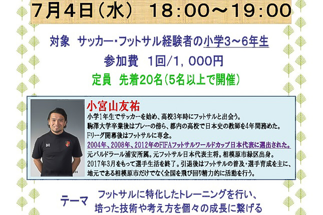 小宮山友祐氏主催 相模原フットサル教室7月日程